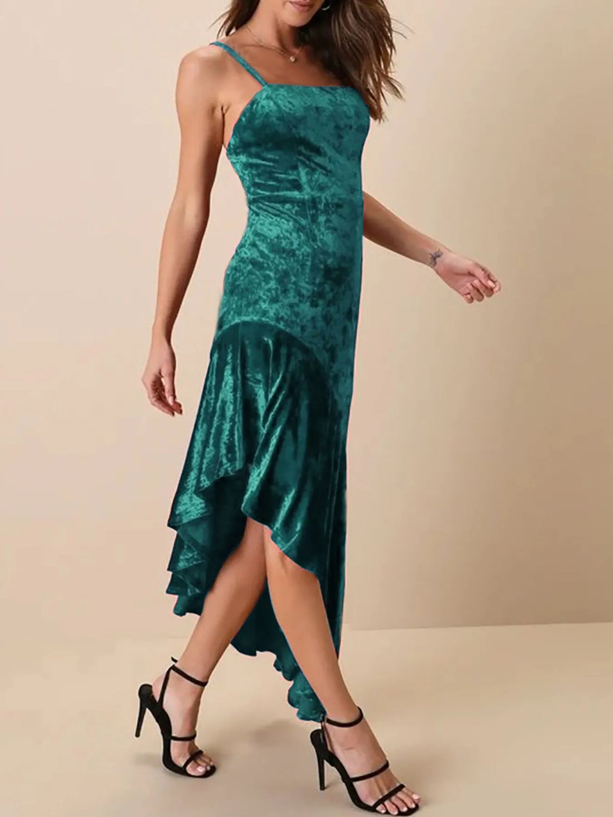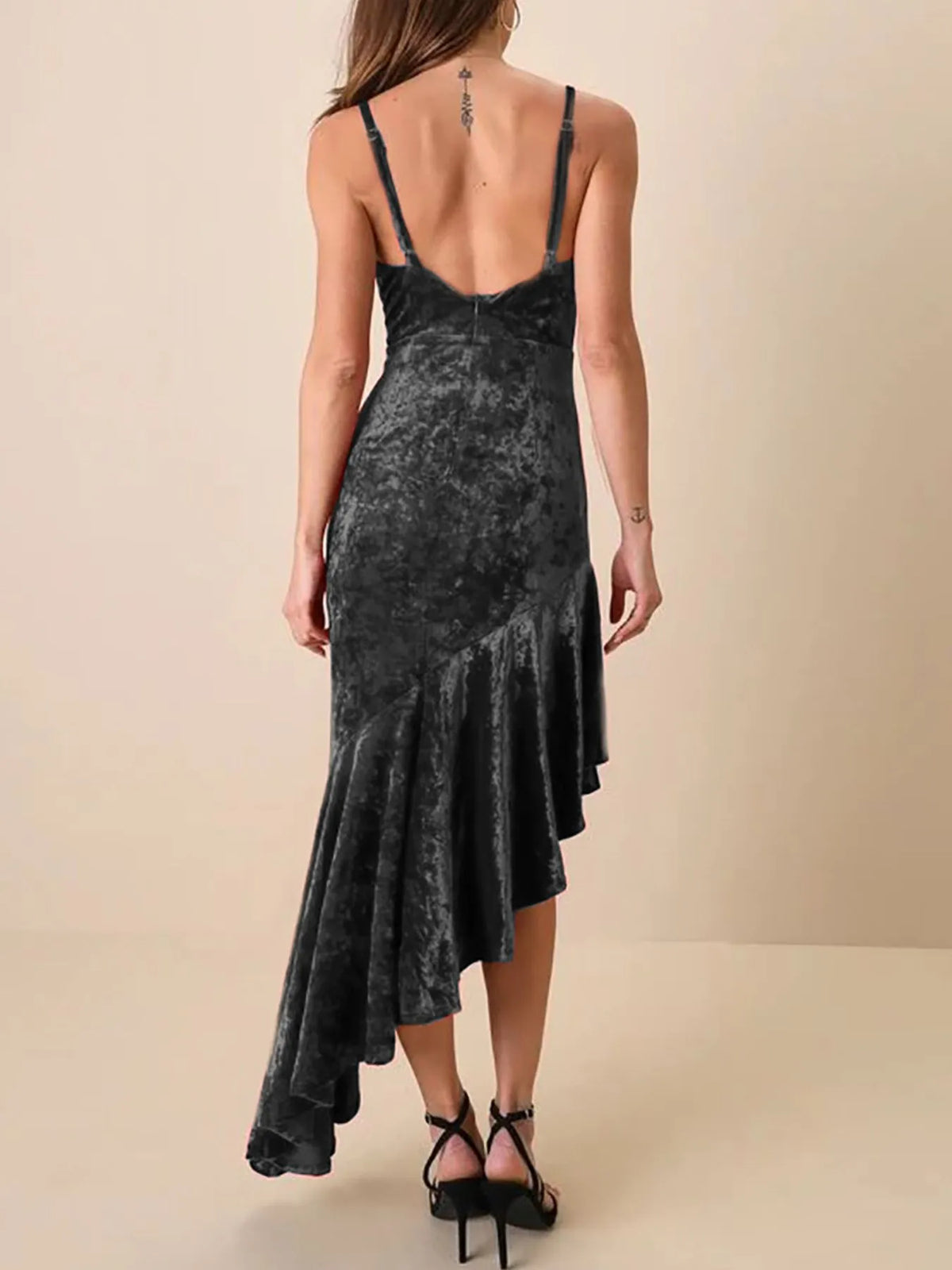 Asymmetrical Velvet Cami Dress with Ruffle Hem